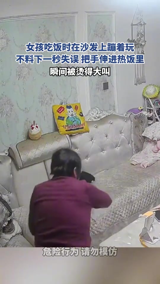 女孩吃饭时在沙发上蹦着玩,不料下一秒失误,把手伸进热饭里