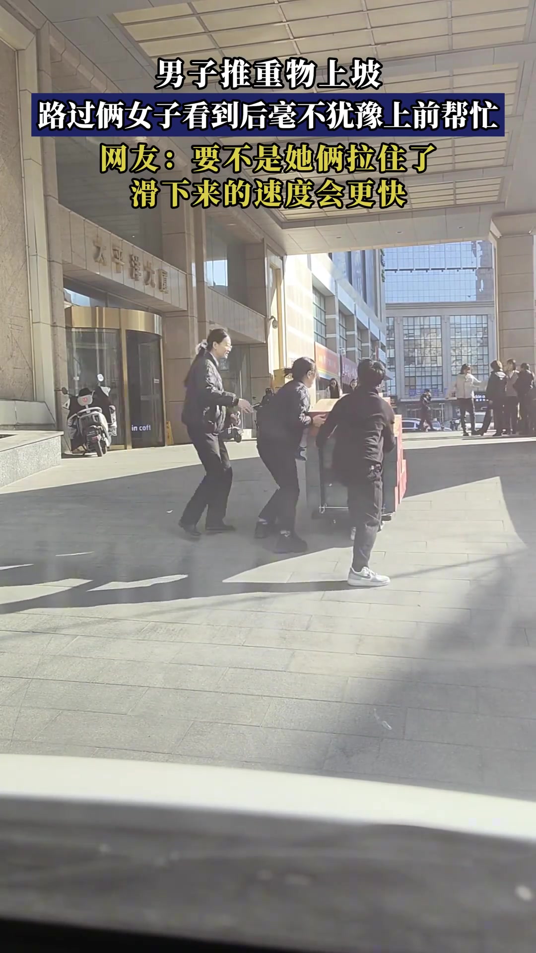 男子推重物上坡,路过俩女子看到后毫不犹豫上前帮忙