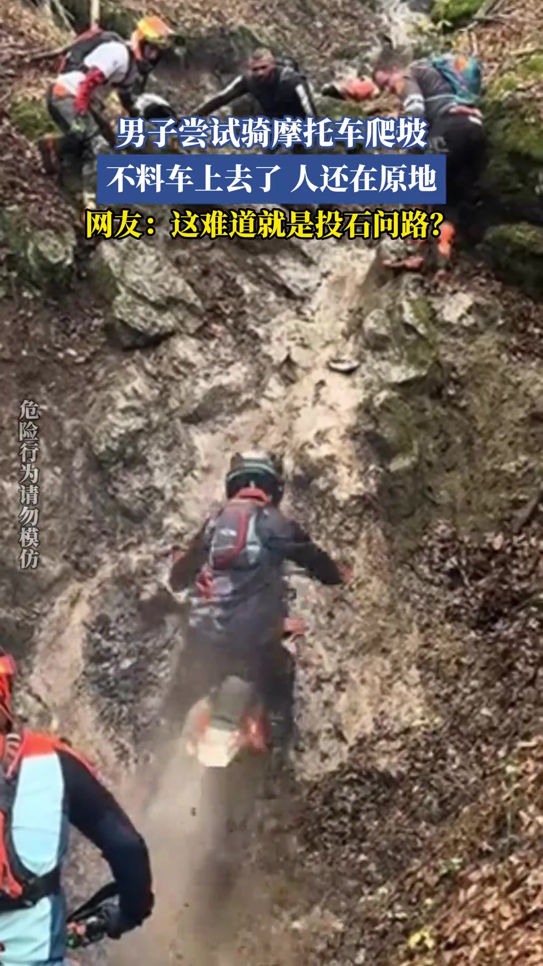 男子尝试骑摩托车爬坡,不料车上去了,人还在原地